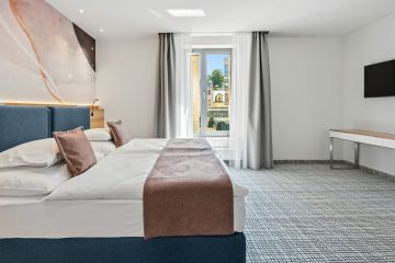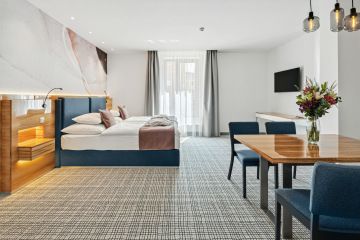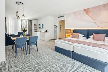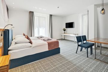 Das großzügige, klimatisierte Zimmer mit einer Mindestgröße von 58 m² ist die ideale Wahl für einen Familienaufenthalt oder einen längeren Urlaub. Im Mittelpunkt steht ein großes Bett mit den Maßen 200 × 200 cm, das bei Bedarf durch ein komfortables Zustellbett ergänzt werden kann. Dank des großzügigen Raumangebots findet hier jeder Gast seinen persönlichen Komfort.
