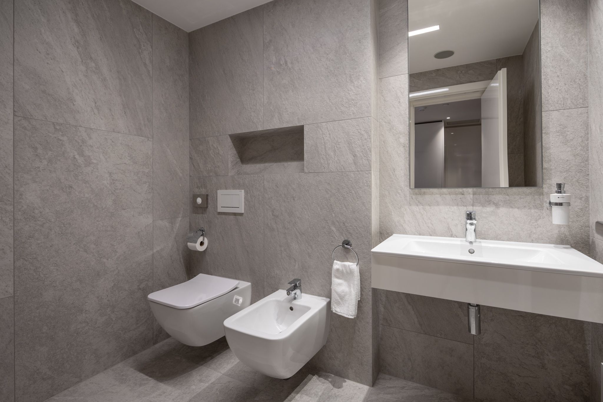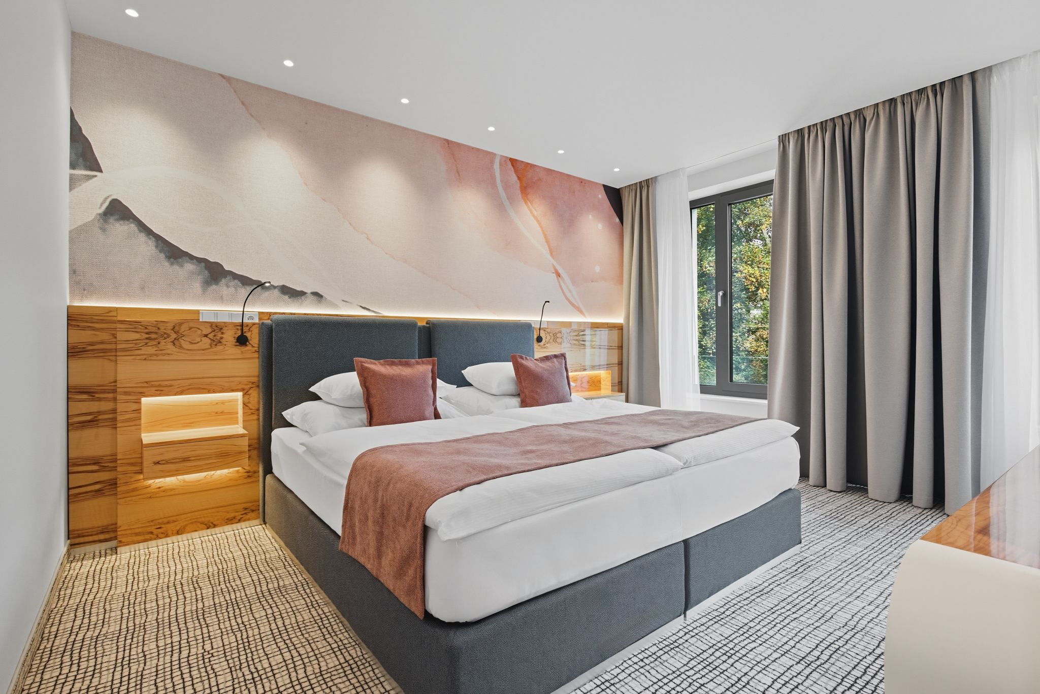 Das großzügige, klimatisierte Zimmer mit einer Fläche von mindestens 45 m² bietet moderne Ausstattung und höchsten Komfort. Im Mittelpunkt steht ein großzügiges Bett (200 × 200 cm), das für ruhigen und erholsamen Schlaf sorgt. Zudem besteht die Möglichkeit einer vollwertigen und komfortablen Aufbettung für einen weiteren Gast.